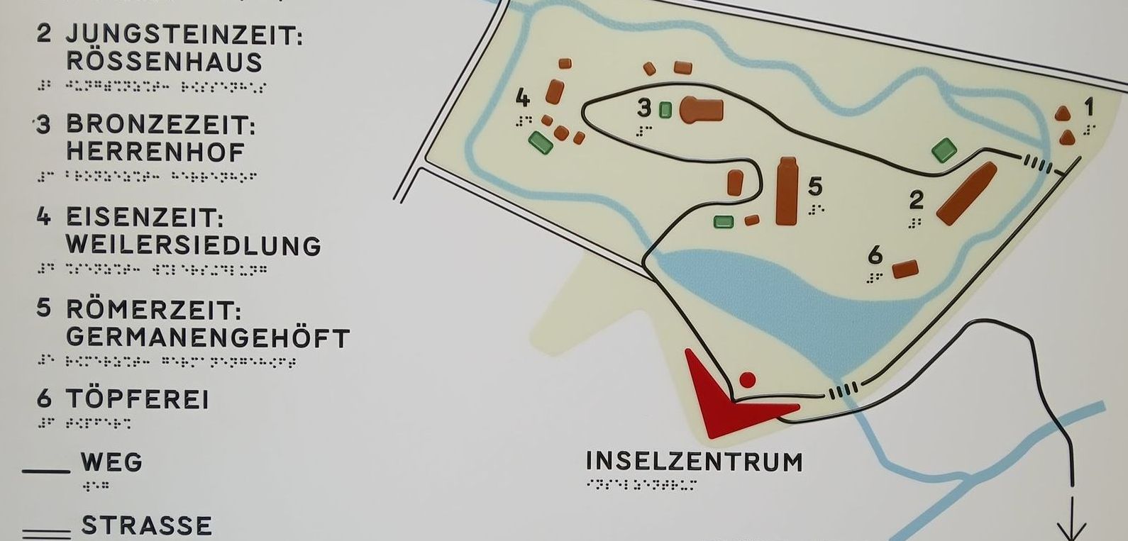 Taktiler Übersichtsplan über das Gelände des Freilichtmuseums und 3D-Druck-Modelle von vier Rekonstruktionshäusern im Maßstab 1:100, in handlicher Größe um sie bei einer Führung dabei zu haben