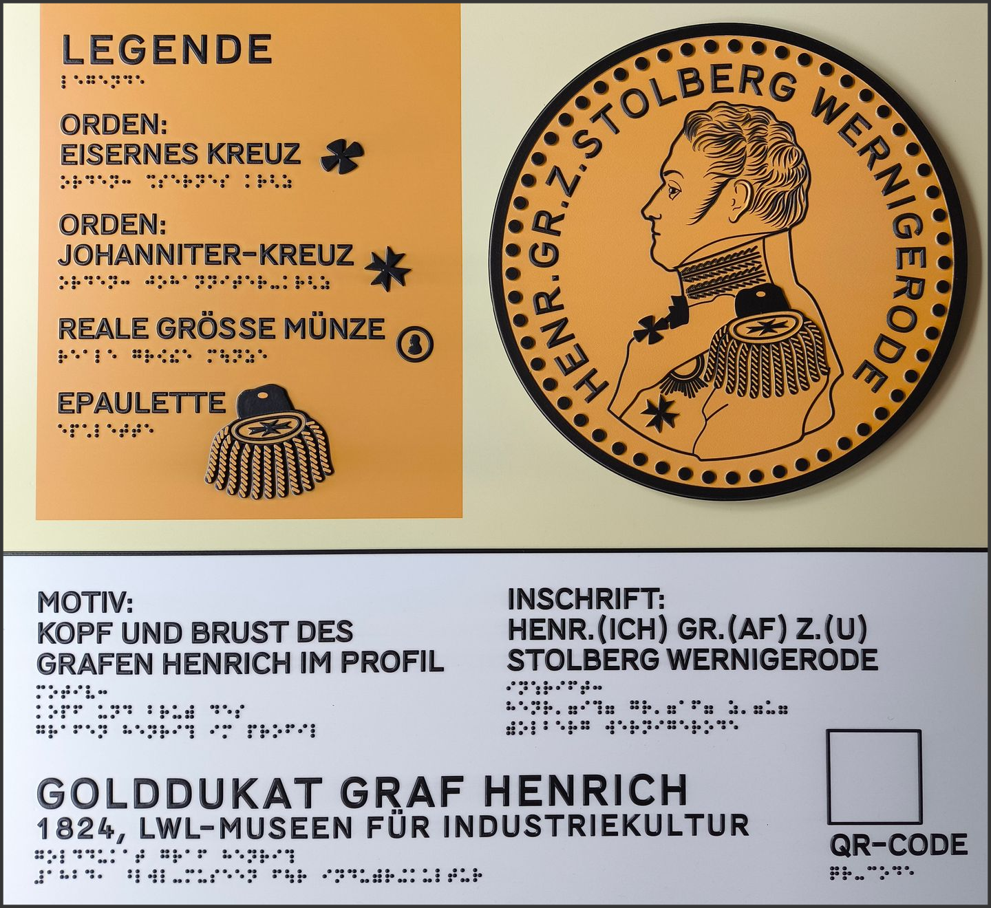 Tastmodell mit Beschriftung in Braille und Reliefschrift, Audiodeskription, Broschüre in Leichter Sprache